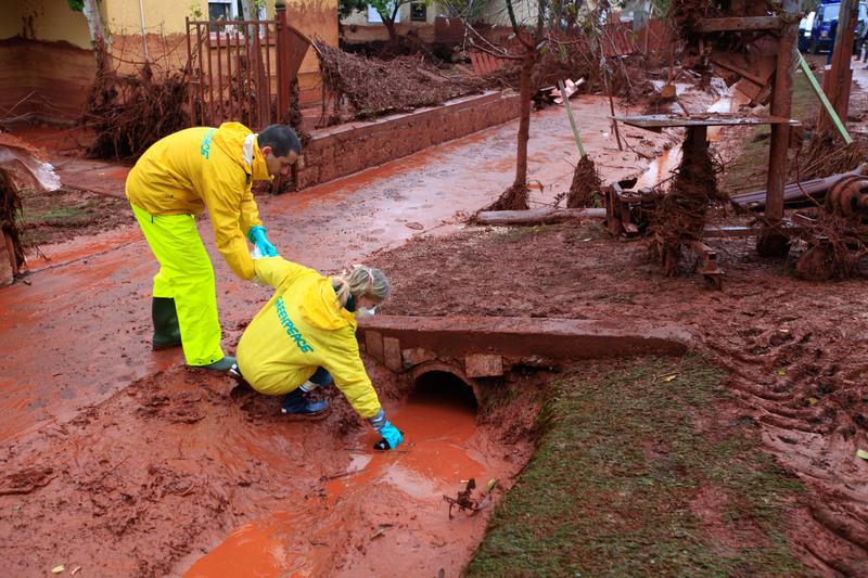 Greenpeace activists take samples from the toxic sludge flood in the village of Kolontar, Hungary. Credit: Waltraud Holzfeind / Greenpeace.